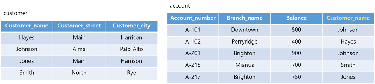 그림 2에서 account 릴레이션의 customer_name은 customer 릴레이션의 주 키(primary key) customer_name을 참조하는 외래 키(foreign key)이다.