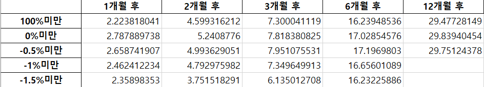 위 함수를 이용해서 매수 타이밍을 각각 무작위, 0% 미만, -1% 미만, -1.5% 미만, -2% 미만으로 했을 때 1~12개월 후의 수익률을 계산해보면 다음과 같은 결과가 나온다.