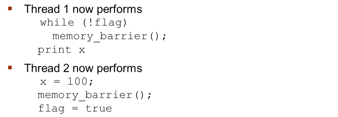 Thread 2에서는 x값이 flag 값보다 먼저 배정되도록 보장한다.