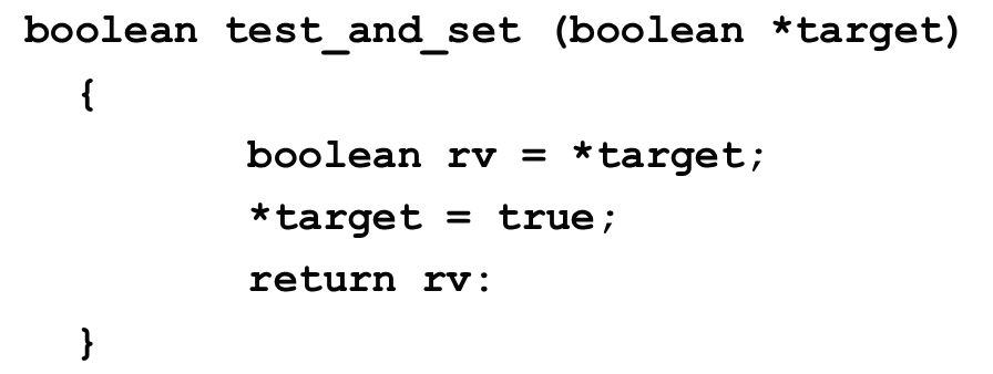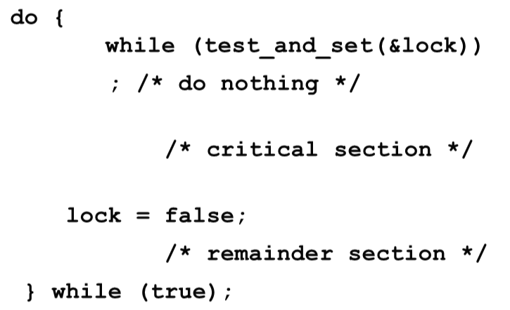 test_and_set() 명령어는 lock이 가능한지 현재 lock 상태를 반환해주고, lock을 true로 set 한다.