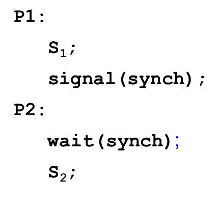 P1에서 S1을 P2에서 S2를 실행하는데, S2는 S1이 끝난 뒤에만 수행되어야 한다.