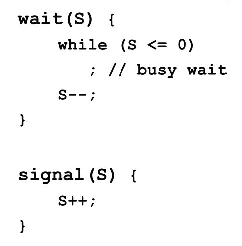 세마포 S는 정수 변수로서, 초기화를 제외하고는 두 개의 표준 원자적 연산 wait()과 signal()로만 접근할 수 있다.