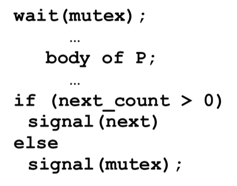 프로세스는 모니터로 들어가기 전에 wait(mutex)를 실행하고, 모니터를 나온 후에는 signal(mutex)를 실행한다.