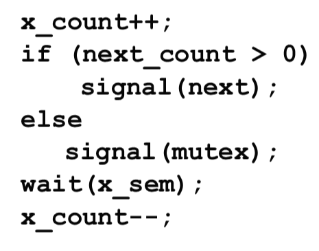condition 변수는 각 조건 x 마다 x_sem이라는 이진 세마포와 x_count라는 정수형 변수를 도입하고 둘 다 0으로 초기화 한다.